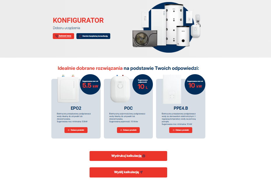4. Otrzymujesz dopasowaną rekomendację urządzenia Kospel, którą możesz wydrukować, wysłać na adres e-mail albo przejrzeć online