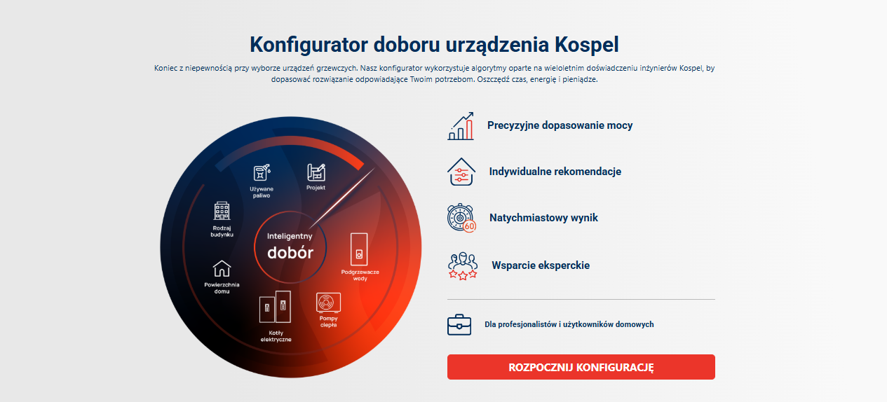 Konfigurator Kospel to inteligentne narzędzie online, które pomaga dobrać idealne urządzenie Tylko na podstawie danych i algorytmów, które bazują na: